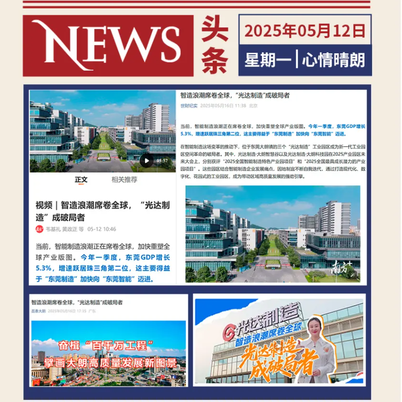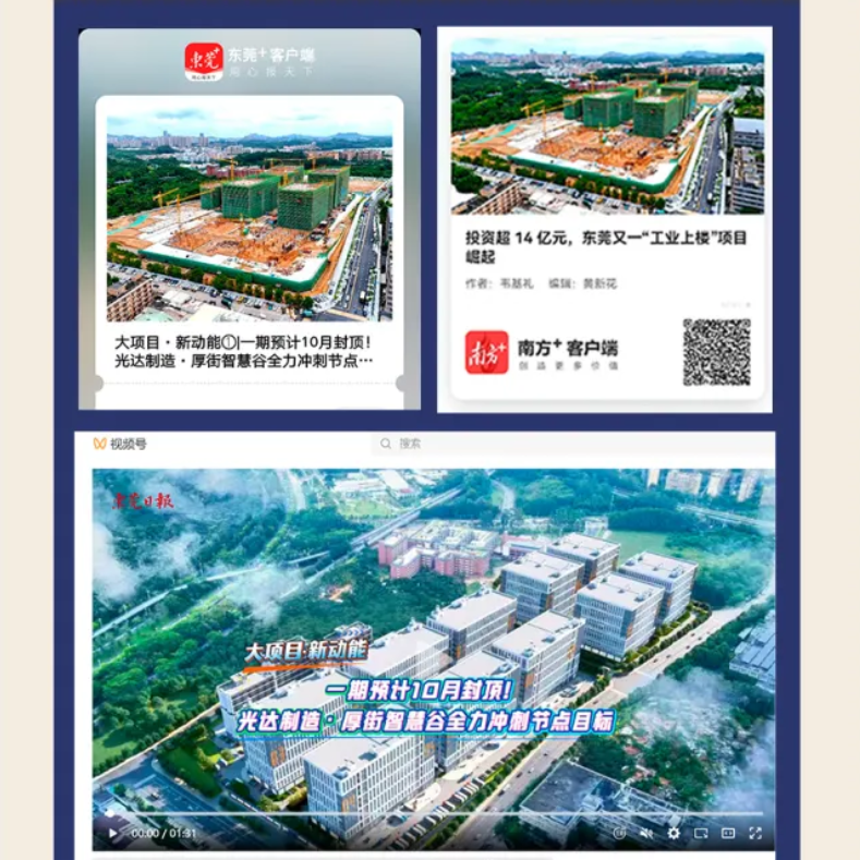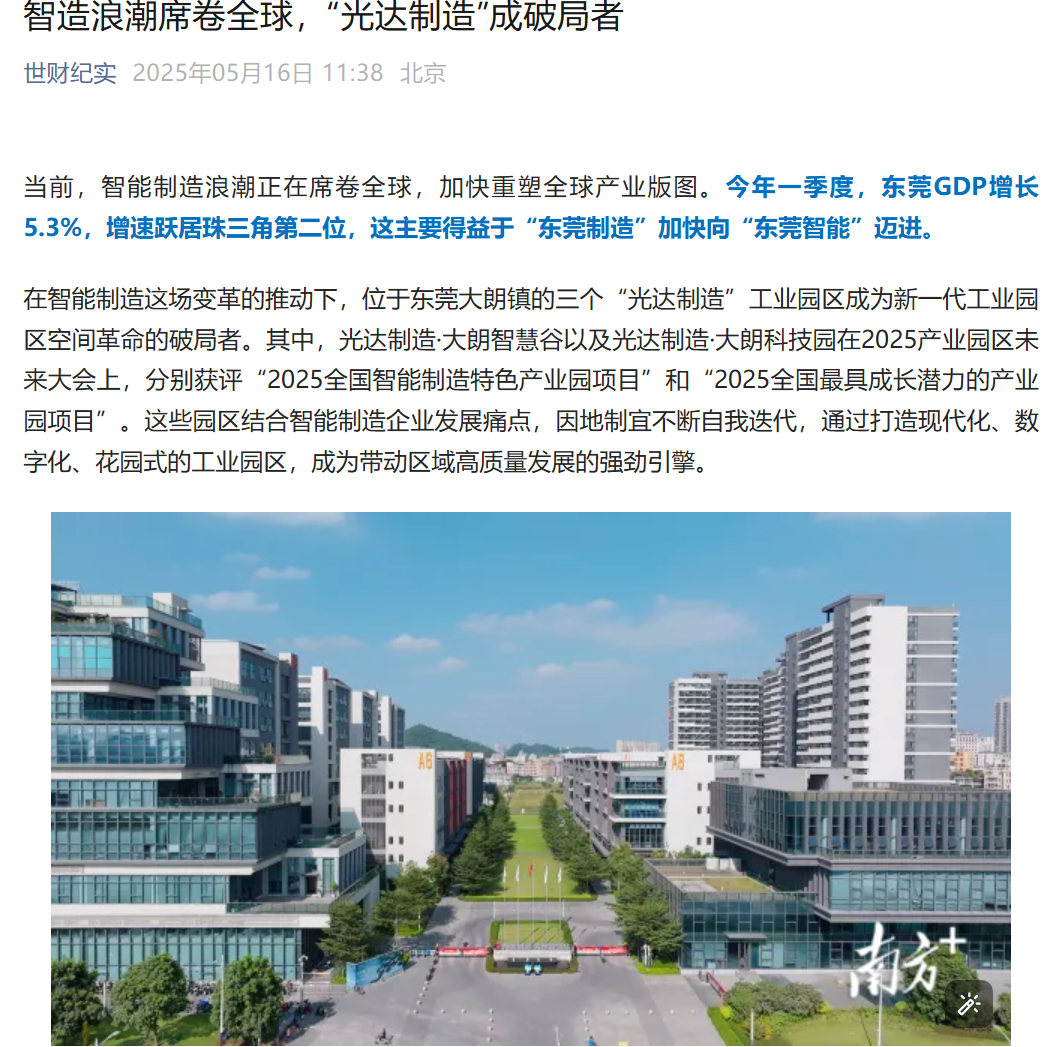 媒体关注度也反映了品牌影响力的提升。2025年,东莞电视台、东莞日报、南方日报到羊城晚报、南方网、搜狐新闻、凤凰网深圳、中国网等超百家主流媒体聚焦园区与企业的成长故事,全年曝光量超500万。全年累计接待政府及行业调研近百次,更是对光大产业模式与发展成果的实地肯定。