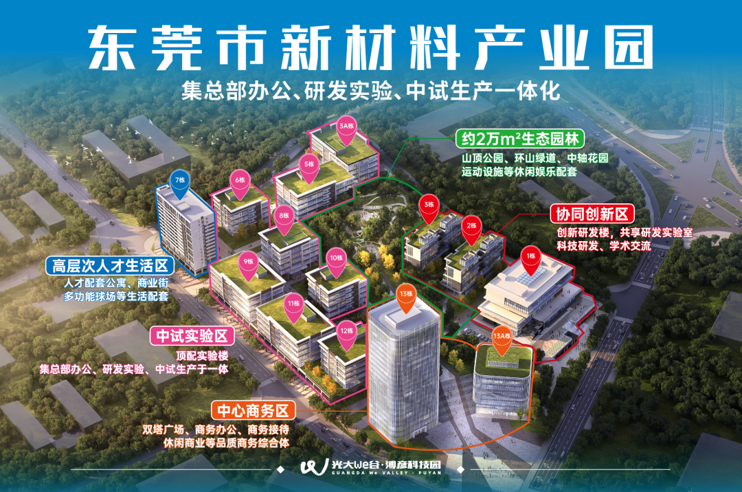 【光大We谷】位于松山湖科学城核心区,以“标杆引领+主题拓展”的特色模式,构建了涵盖企业孵化、研发办公、企业总部及商业配套的多元业态布局。其中,光大We谷·溥彦科技园聚焦新材料领域,为企业提供集总部办公、研发实验与中试生产于一体的专业化空间与配套服务。自2024年获评首批“东莞市新材料产业园”以来,园区产业集聚力持续增强,已成功吸引昊辉新材料、颖兴、迪思科、迅杰通等二十余家新材料细分领域优质企业入驻,助推区域新材料产业集群蓬勃发展。