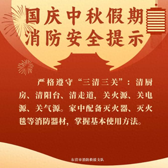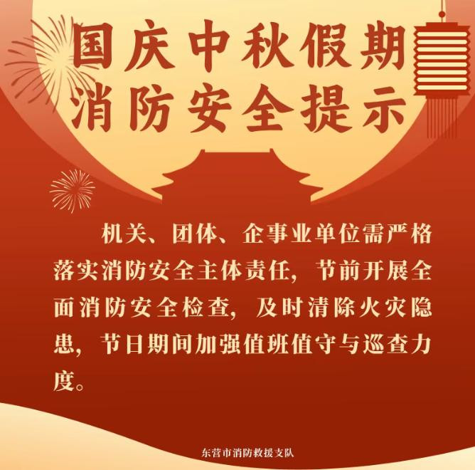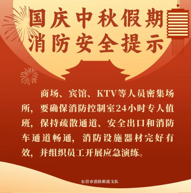 国庆中秋假期期间人流、物流、车流剧增,旅游、住宿、购物、娱乐、餐饮等人员密集场所的火灾风险也随之加大,东营消防提醒广大市民群众欢度佳节的同时,牢记消防安全。(大众新闻记者 杨珣 通讯员 孙子潼)